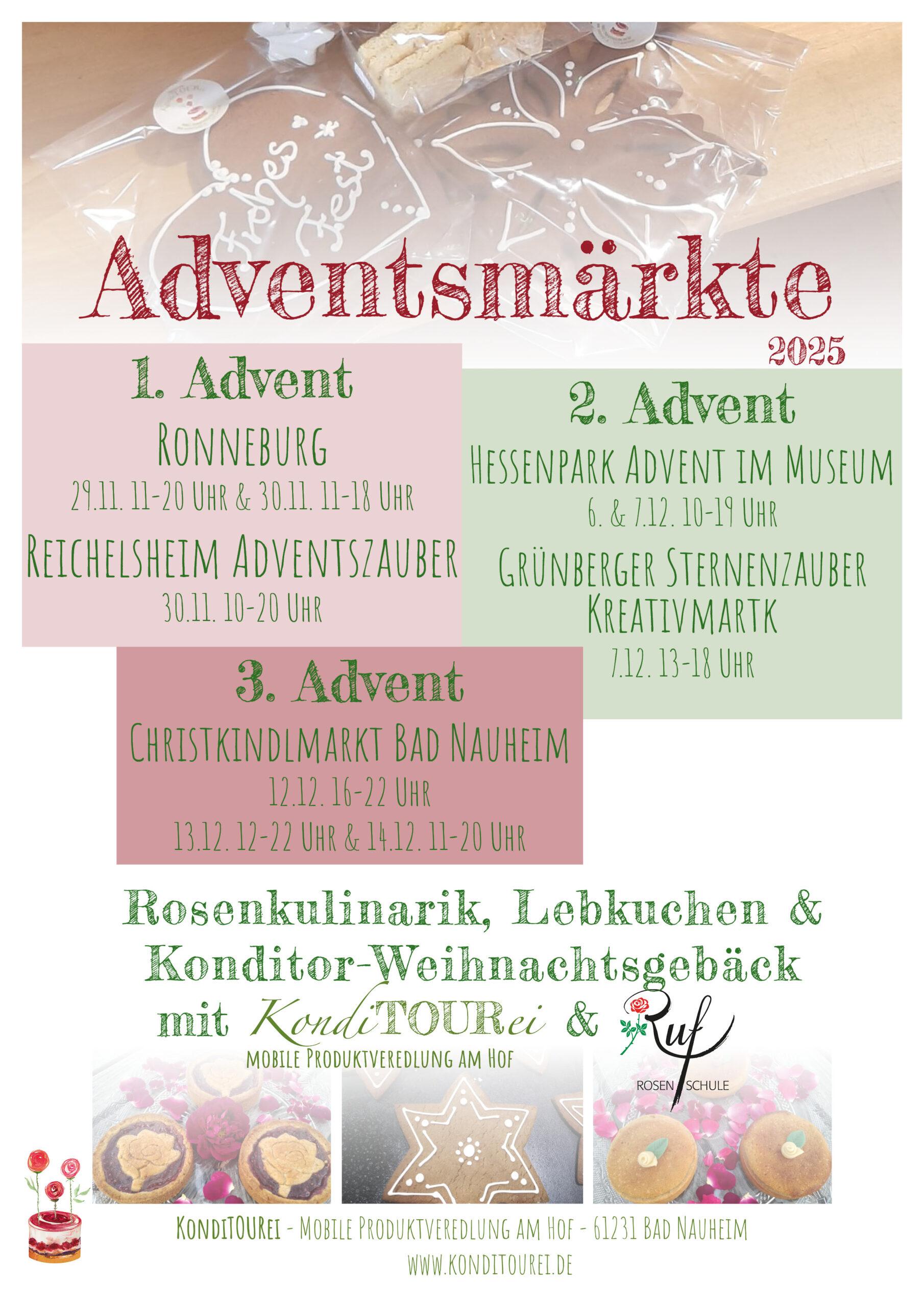 Im wunderschönen Jugendstilbau der Trinkkuranlage sowie vor der Dankeskirche stimmen urige Holzhütten mit einem abwechslungsreichen Angebot von liebevollem Kunsthandwerk bis hin zu Glühwein und süßen Weihnachtsleckereien auf das bevorstehende Weihnachtsfest ein. Bad Nauheimer Chöre und Musikgruppen sorgen mit Gesang für eine stimmungsvolle Atmosphäre. Die KondiTOURei bietet rosige Kulinarik aus Steinfurther Bioland Rosenblüten sowie handwerklich hergestelltes …